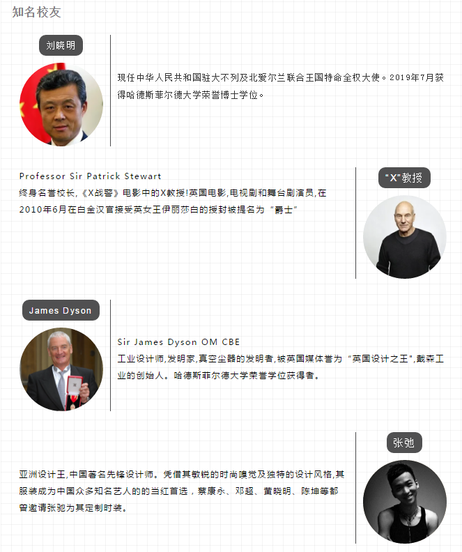中华人民共和国驻大不列及北爱尔兰联合王国特命全权大使刘晓明、戴森工业的创始人 Sr James Dyson OMCBE、3M公司董事长兼 CEOSIR George Buckley、终身名誉校长 Professor Sir Patrick Stewart、Burberry的创意总监兼前 CEOChristopher Bailey MBE、中国著名先锋设计师张弛等。